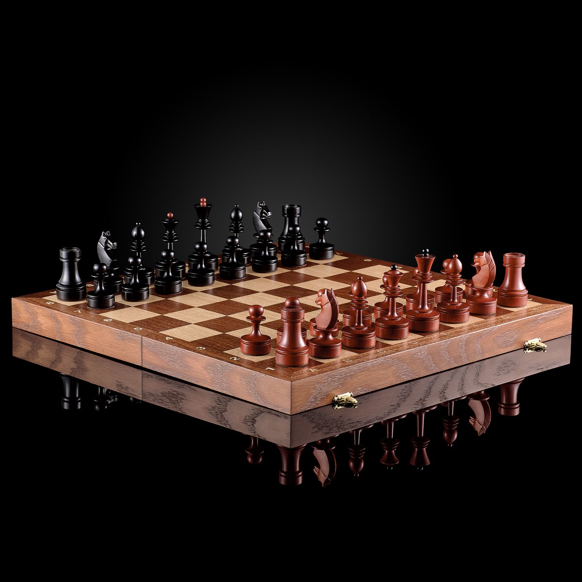 При изготовлении набора «Пражские мотивы» мастера KADUN выбрали древесину ценных пород. Доска выполнена из массива тонированного дуба. Его светлый оттенок красиво гармонирует с кремовыми клетками из клёна и тёмными клетками из африканского сапеле.