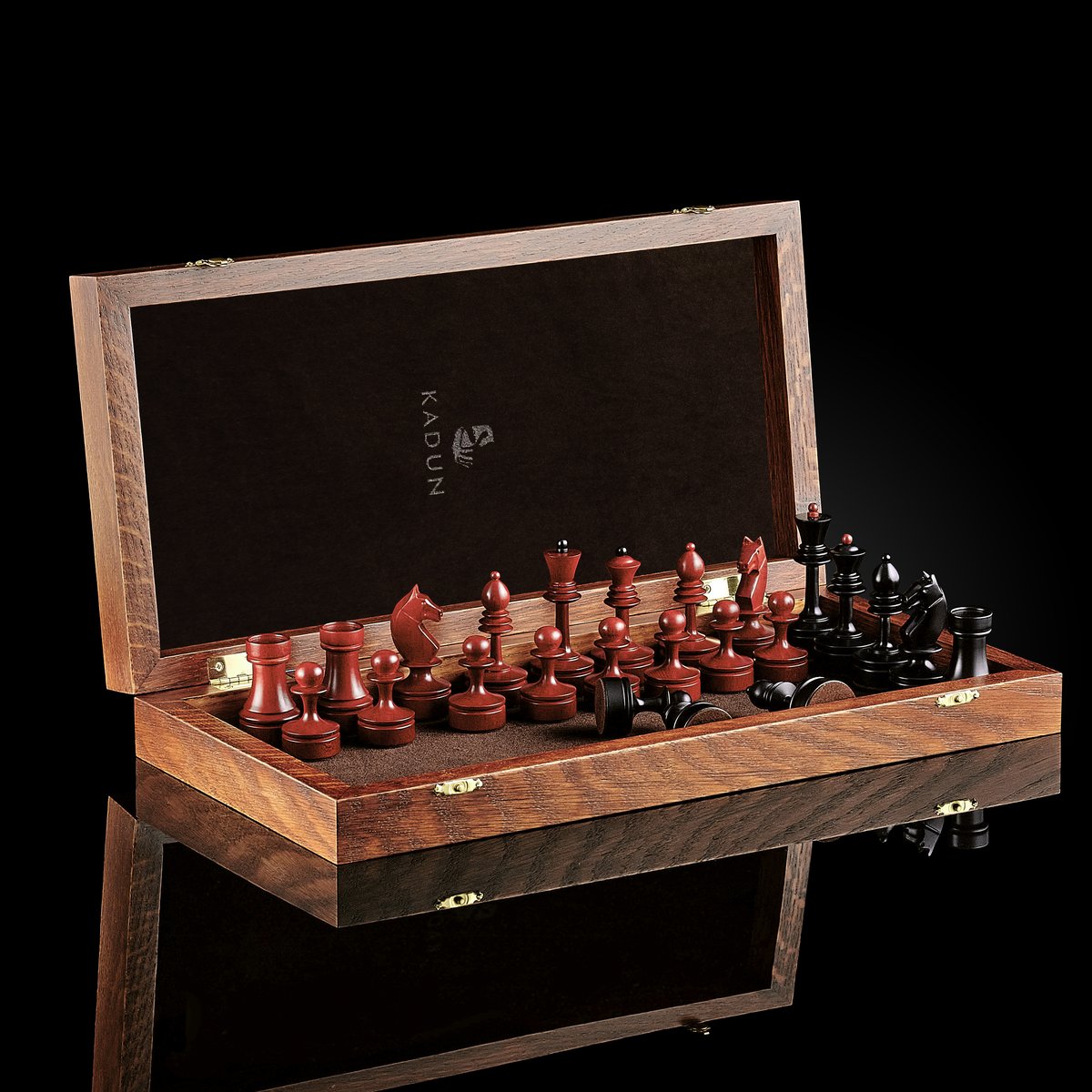 При изготовлении набора «Пражские мотивы» мастера KADUN выбрали древесину ценных пород. Доска выполнена из массива тонированного дуба. Его светлый оттенок красиво гармонирует с кремовыми клетками из клёна и тёмными клетками из африканского сапеле.
