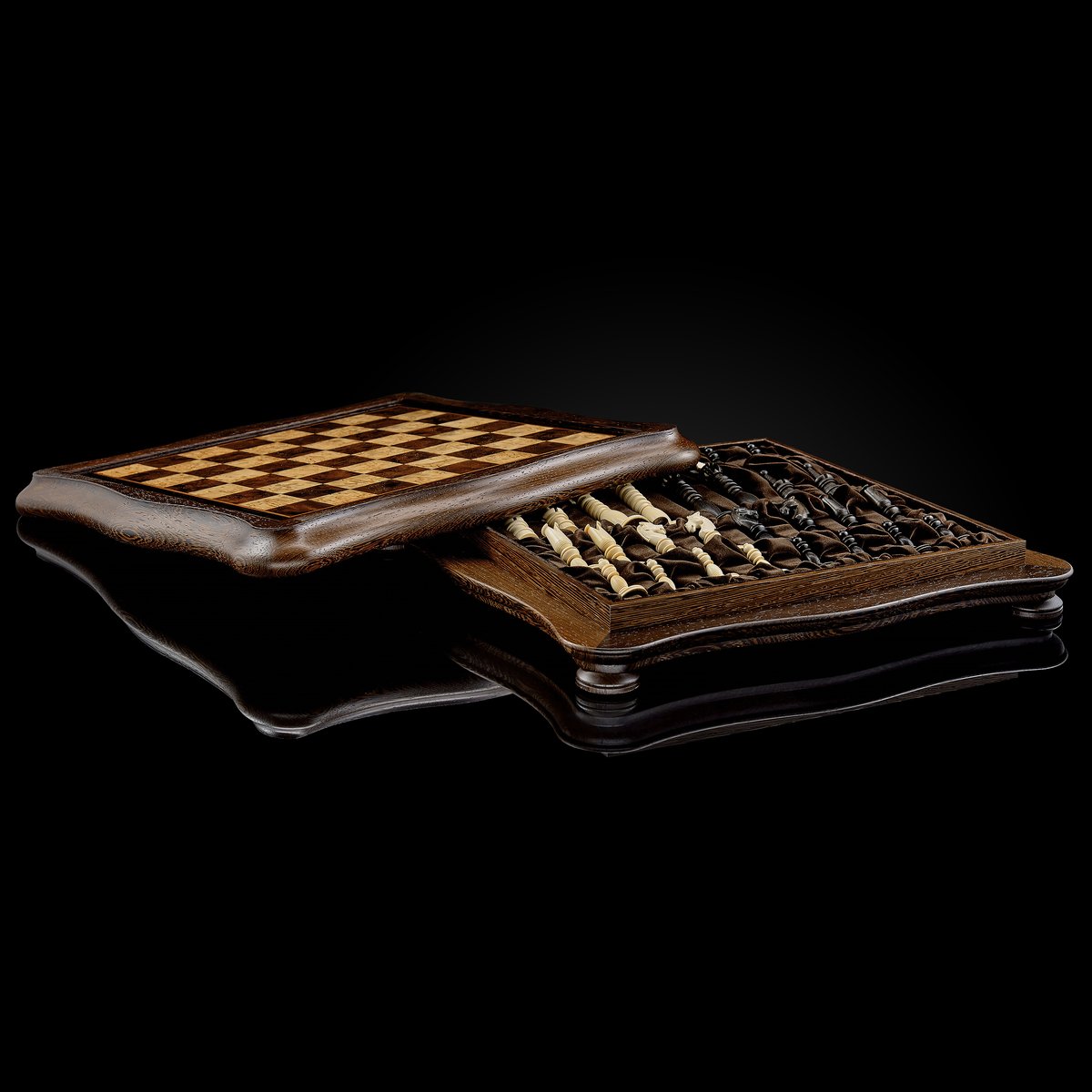 Корпус доски имеет съемную верхнюю крышку с игровым полем. Под крышкой находится мягкий ложемент из бархата с отдельными ячейками для каждой фигуры. В комплект входит кейс из ясеня и макассара ручной работы.