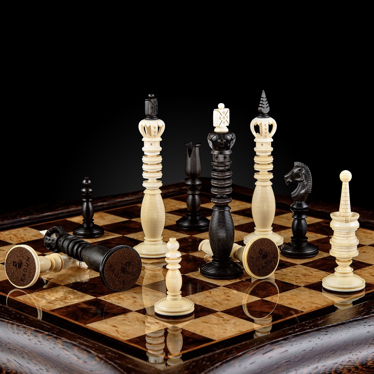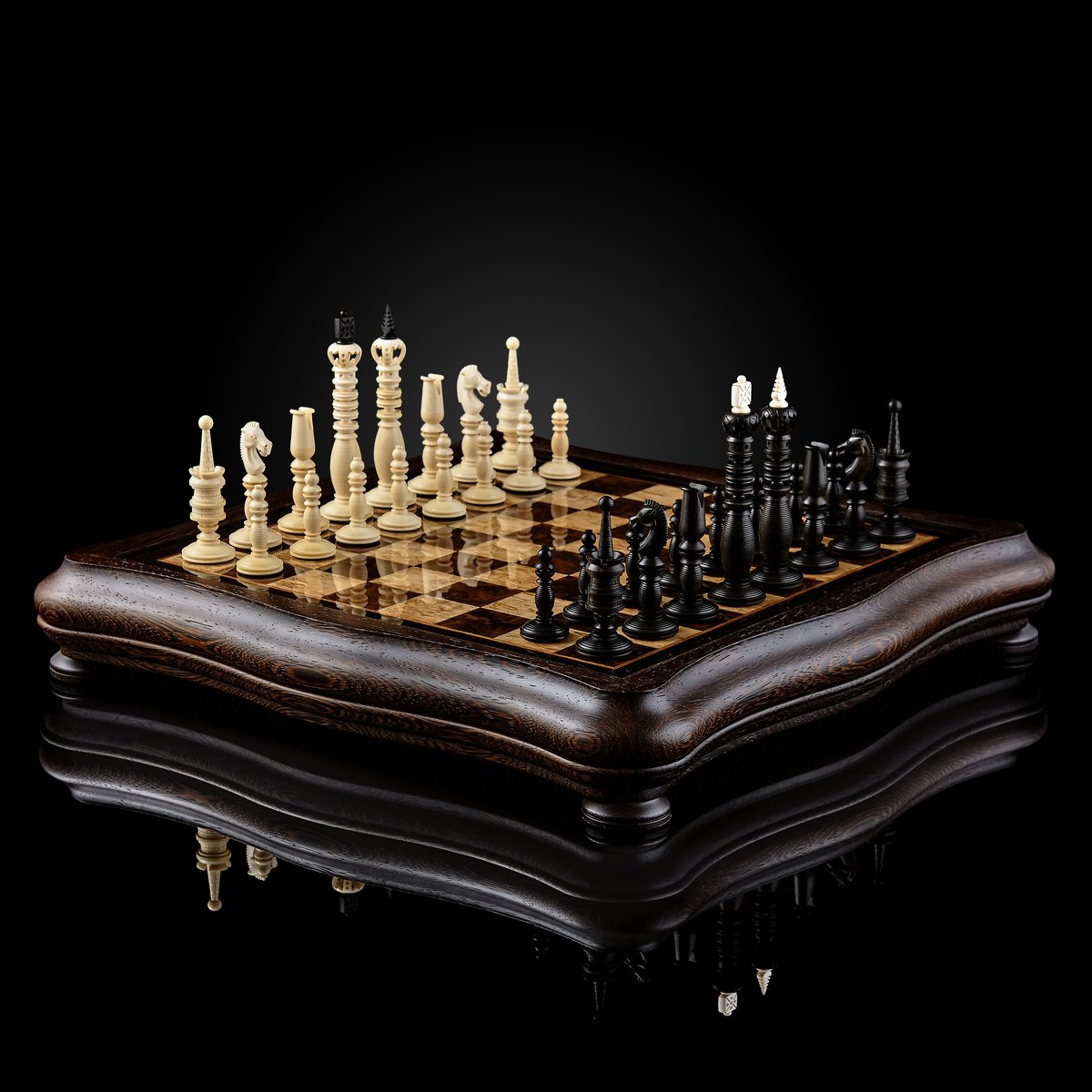 Особого внимания заслуживают фигуры. Для создания темных фигур использован цейлонский эбен, один из самых тяжелых и прочных видов древесины. Он имеет практически черный оттенок с натуральным металлическим блеском. Светлые фигуры выполнены из бивня мамонта, высокоценного костного материала, история которого насчитывает многие тысячелетия.