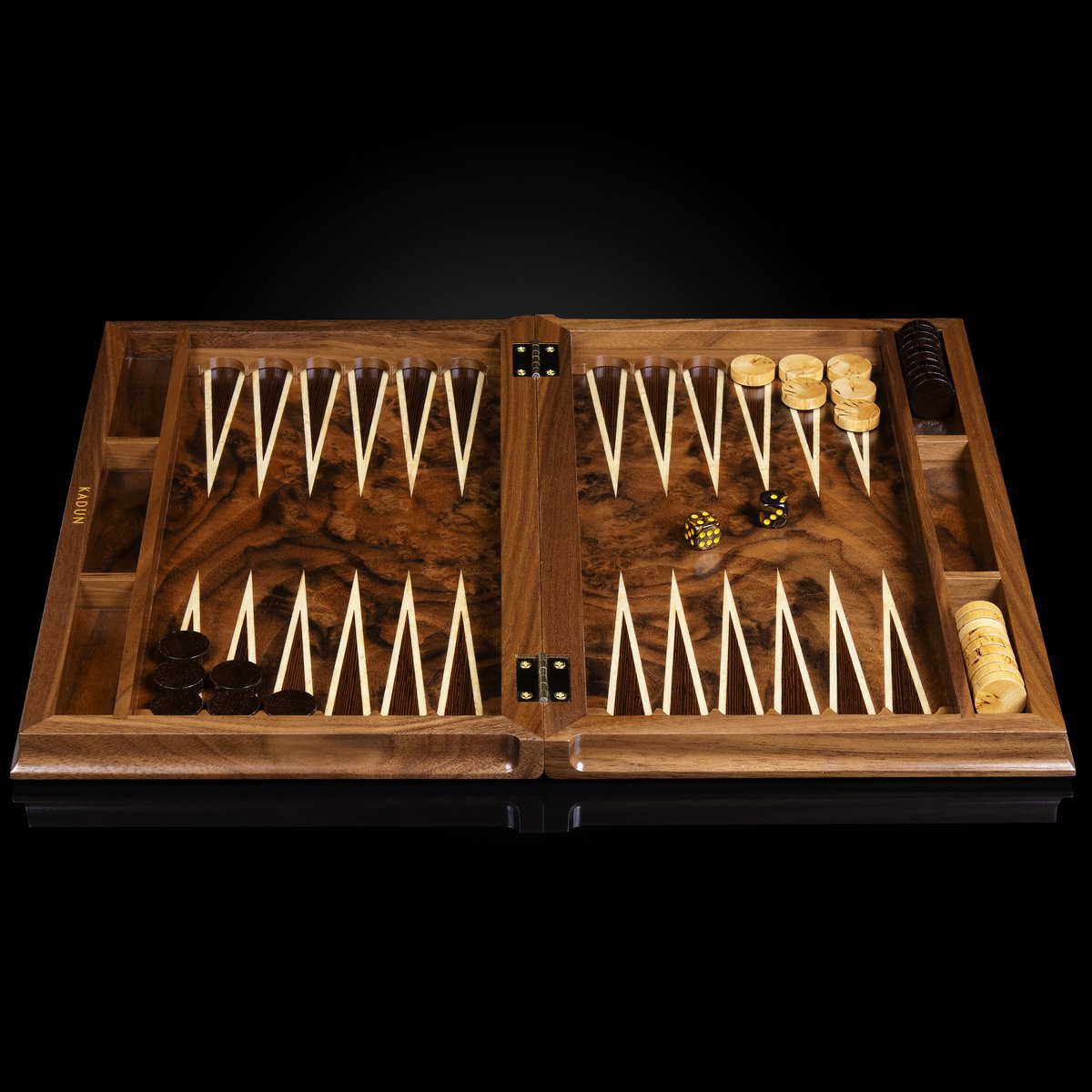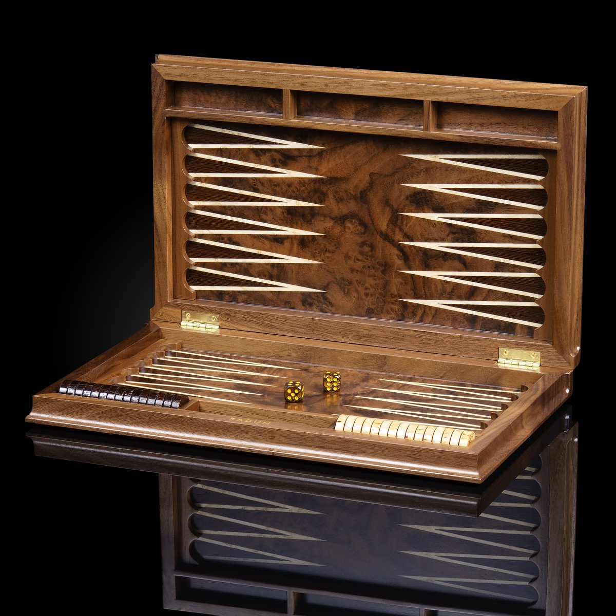 Игровое поле из венге и карельской берёзы строит изысканный контраст: тёмные линии венге напоминают тенистые лесные тропы, а тёплое золото берёзы - солнечные отблески открытых равнин.