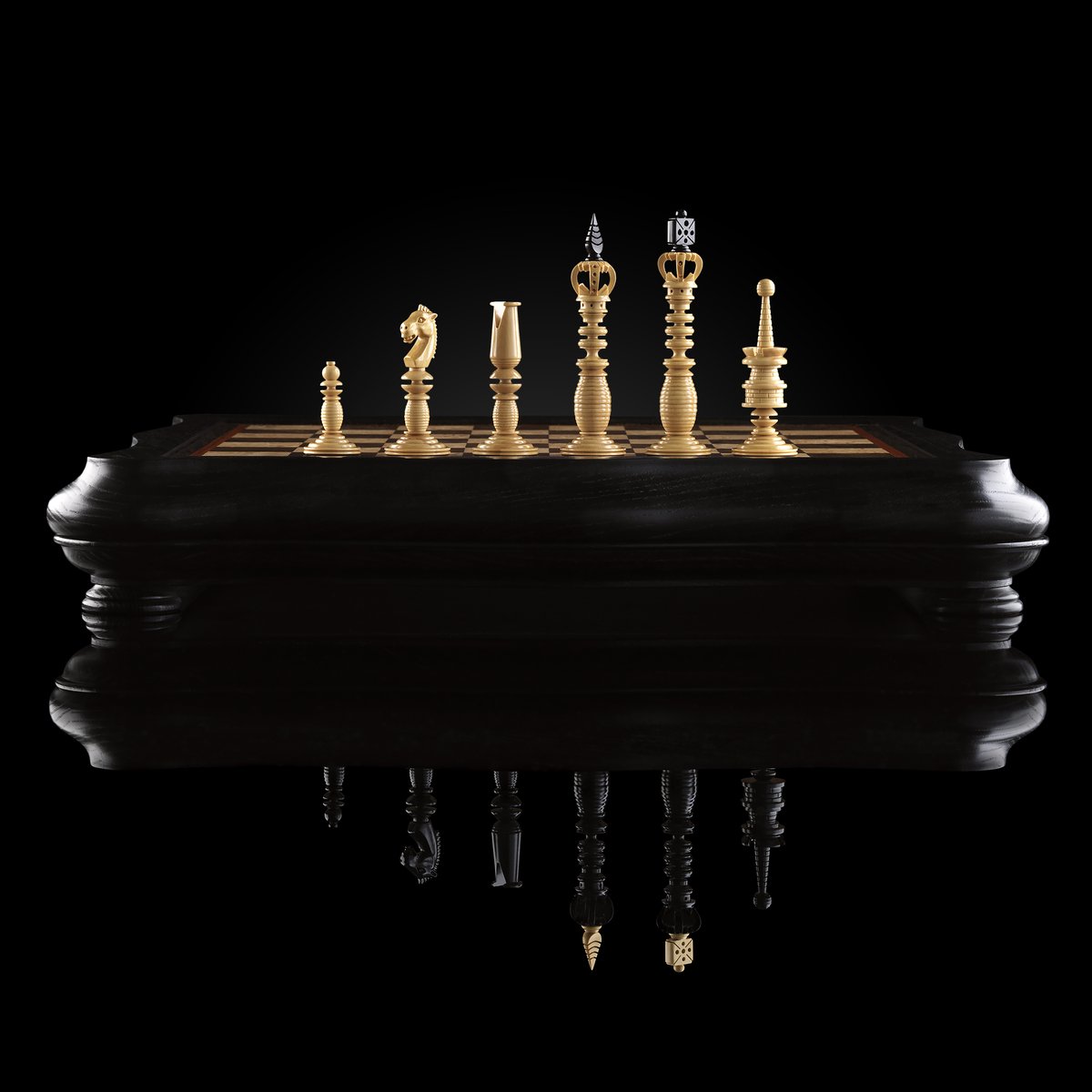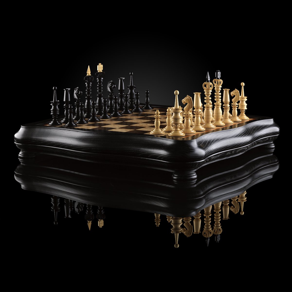 Корпус шахматной доски выполнен из массива ясеня, который имеет насыщенный черный цвет благодаря тонировке. Тонировка наносится и при создании темных фигур из колхидского самшита. Тёмные клетки выполнены из корня ореха, для которого характерен выраженный шоколадный оттенок.